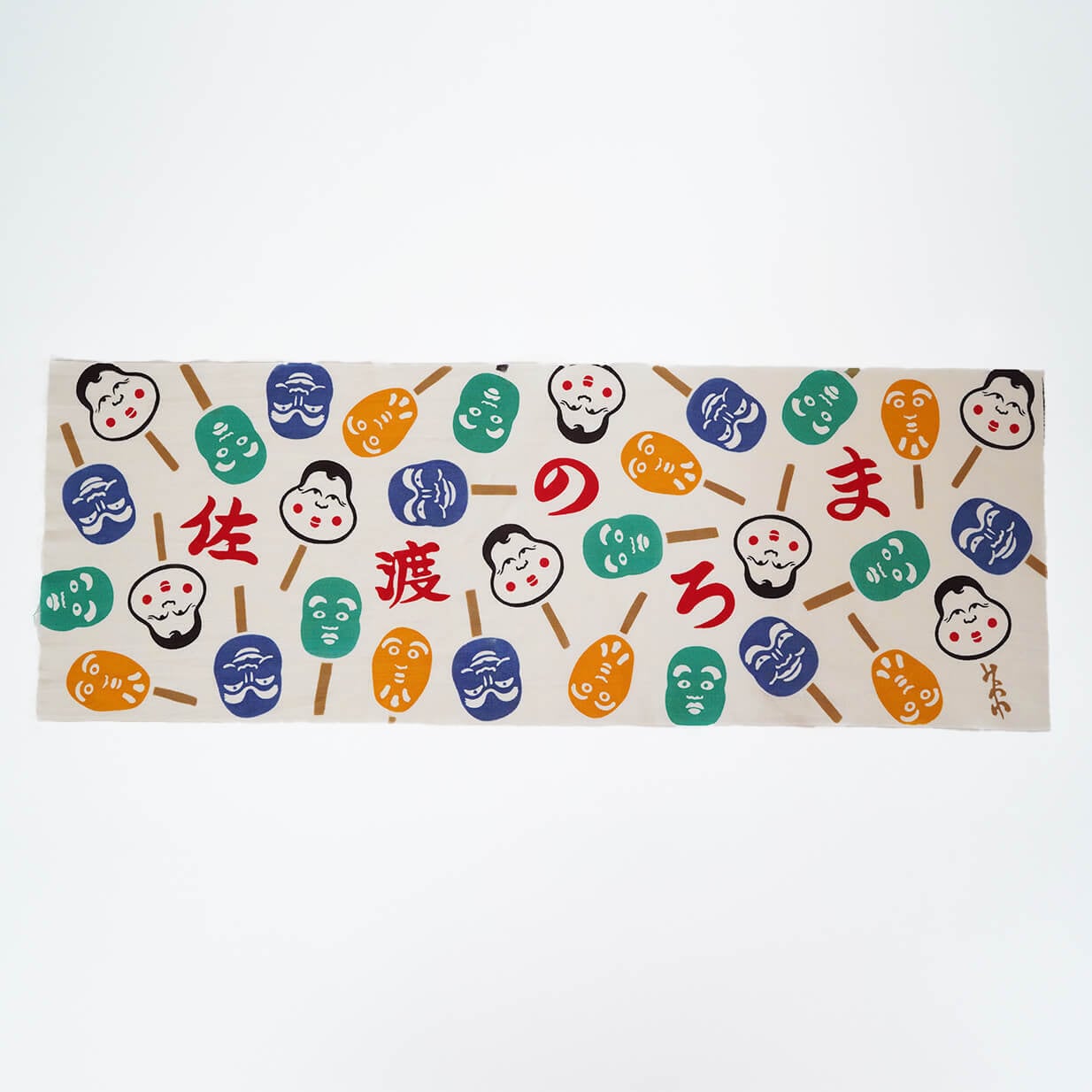 地色は白に見えますが、実はうっすらクレア染めになっており、少し懐かしい雰囲気にしています。昭和感ただようのろま人形手ぬぐいを、ぜひご愛用いただけたら嬉しいです*